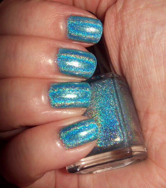 This is Glitter Gal's blue holographic polish. I am loathe to waste a precious holo, so I economised by painting 2 coats over a light blue polish base - the holo effect is still amazing like this and the colour pops even more.